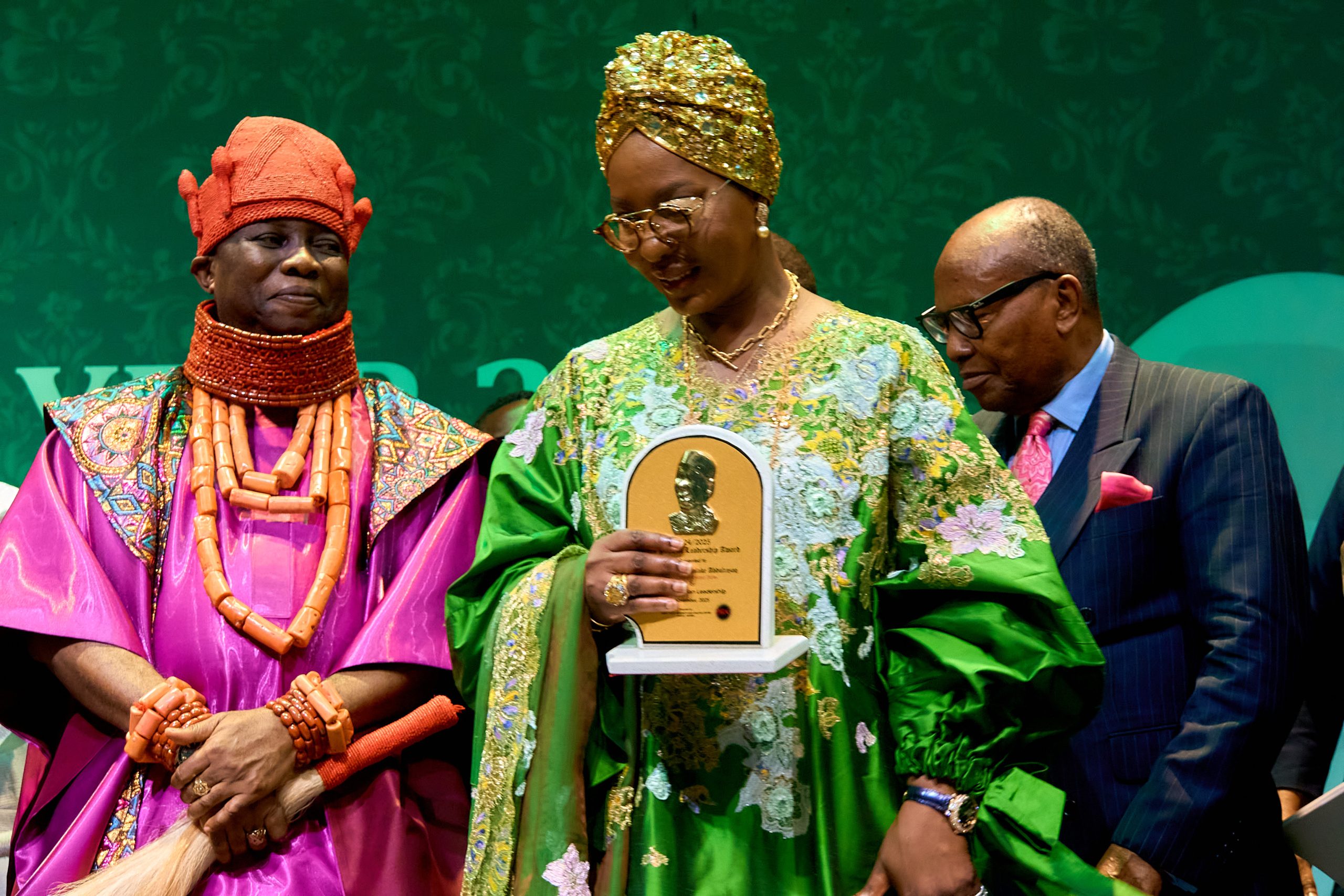 Her Excellency Ambassador Prof. Olufolake Abdulrazaq receiving The Zik Prize in Humanitarian Leadership 2025 from His Royal Majesty Professor Epiphany Chukwuemeka Azinge, SAN, The Asagba of Asaba, on Sunday, 16 November 2025, at Eko Hotels & Suites, Victoria Island, Lagos.